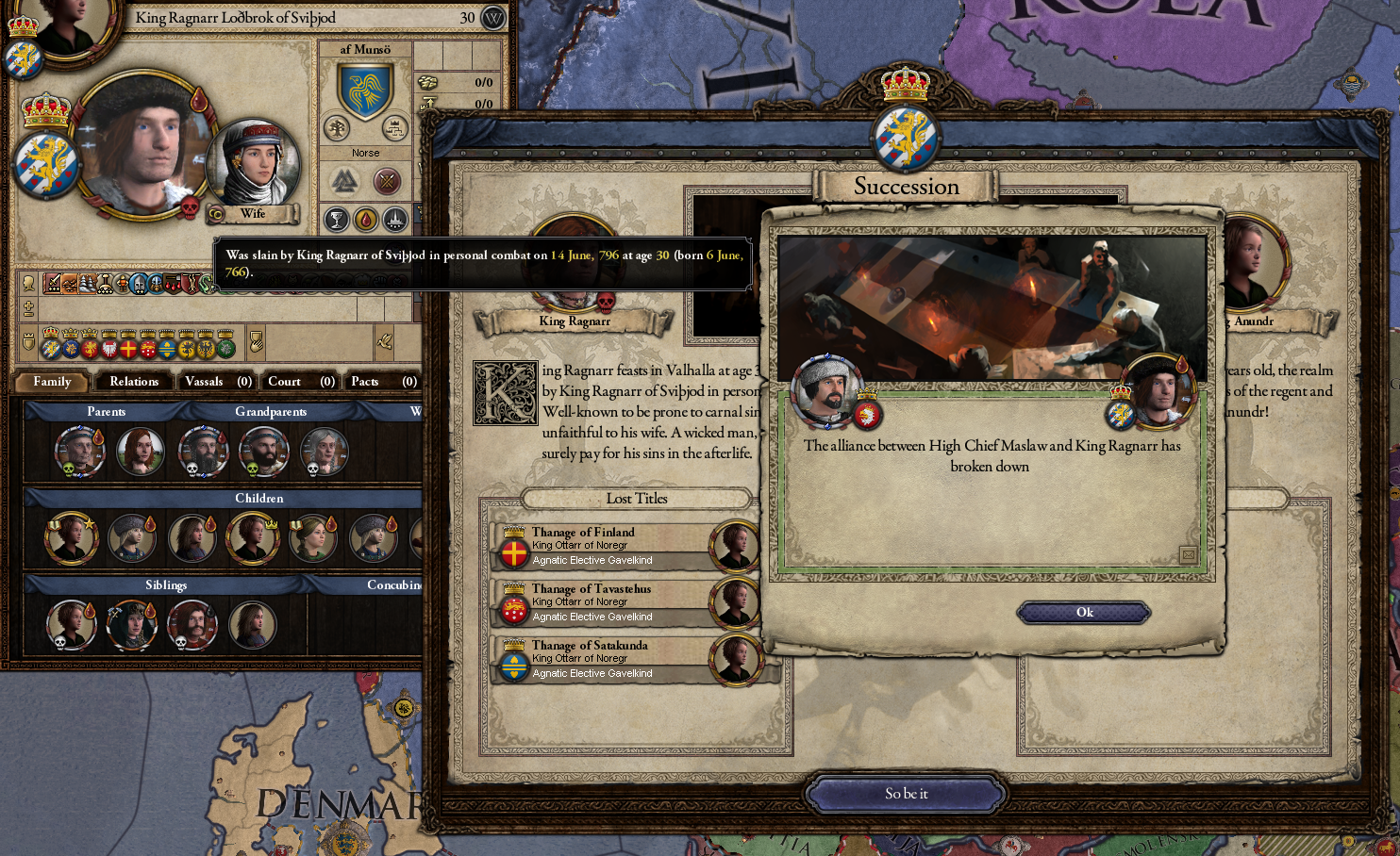 Today I killed myself in a duel, after beating somebody else cause they insulted me. I was messing with ck2plus and had some weird interactions with the events, mostly fine if you remain unpaused, but then they would still end up doing this shit once in a while.