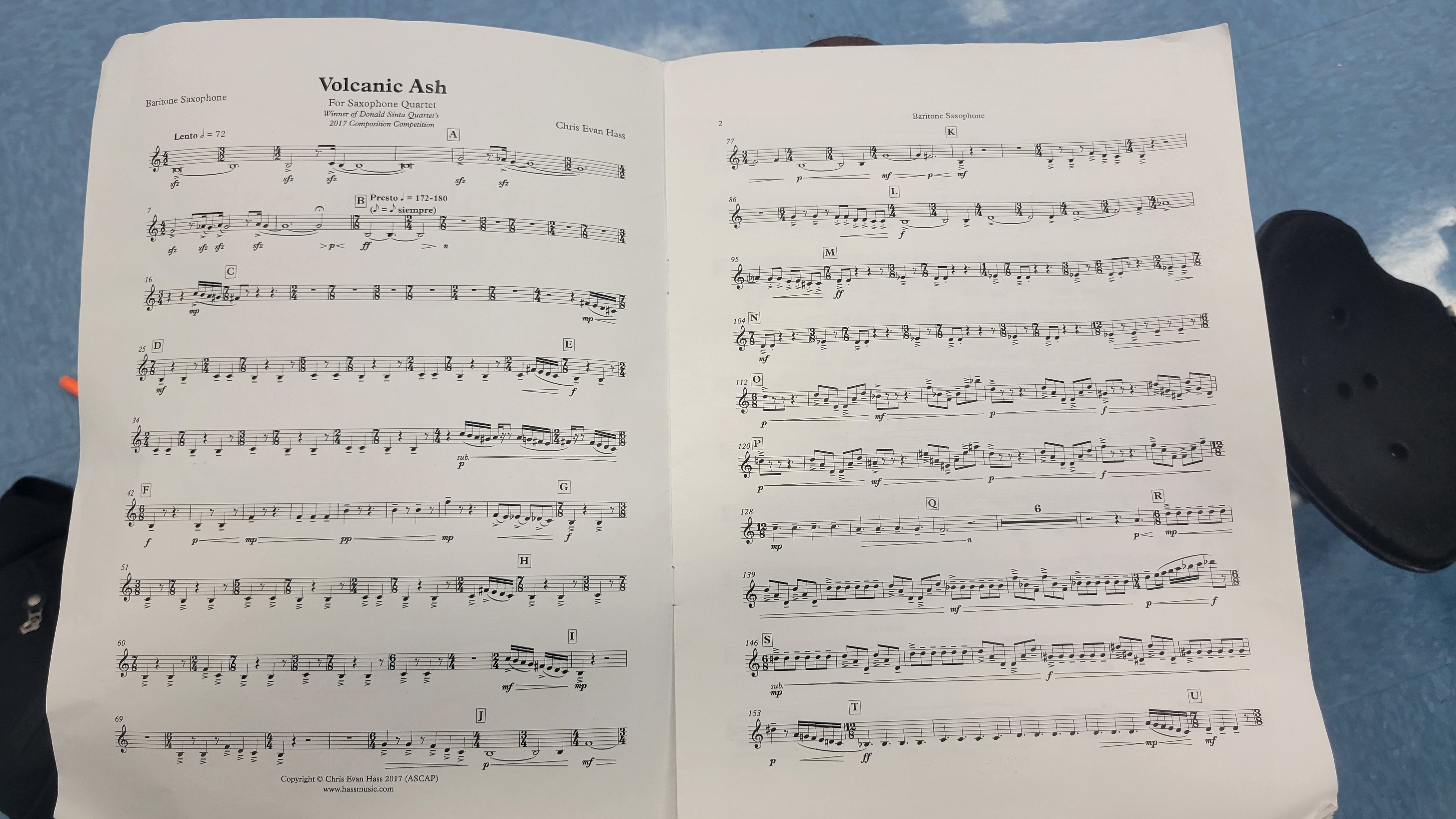 A buddy of mine wanted to play this saxophone quartet with called, "Volcanic Ash". Here is the sheet music for my part (Baritone Saxophone).