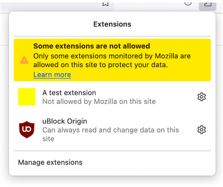 >Certain Firefox users may come across a message in the extensions panel indicating that their add-ons are not allowed on the site currently open. As of Firefox version 115, we have introduced a new back-end feature to only allow some extensions monitored by Mozilla to run on specific websites for various reasons, including security concerns.